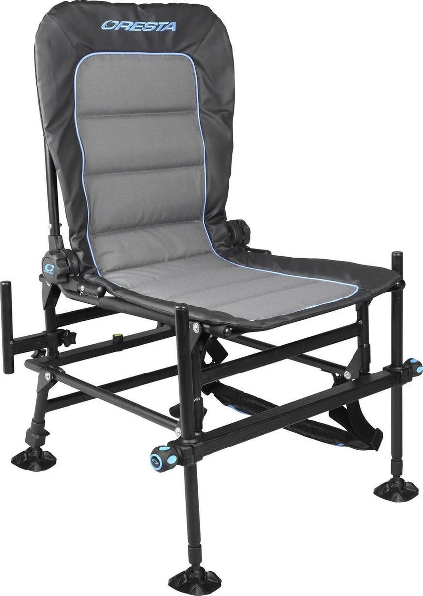 De nieuwe Blackthorne stoel van Cresta is gebaseerd op zijn voorganger en dit jaar verder verbeterd. De stoel heeft een dubbel uitklap mechanisme waardoor de zitting direct op 45 cm hoogte komt te staan. Doordat de zitting en leuning gevoerd zijn, zit je ook bij lange sessies comfortabel op de stoel. Aan de achterzijde van de stoel zijn twee afneembare armen gemonteerd waarin je een paraplu of hengelsteun kunt plaatsen.