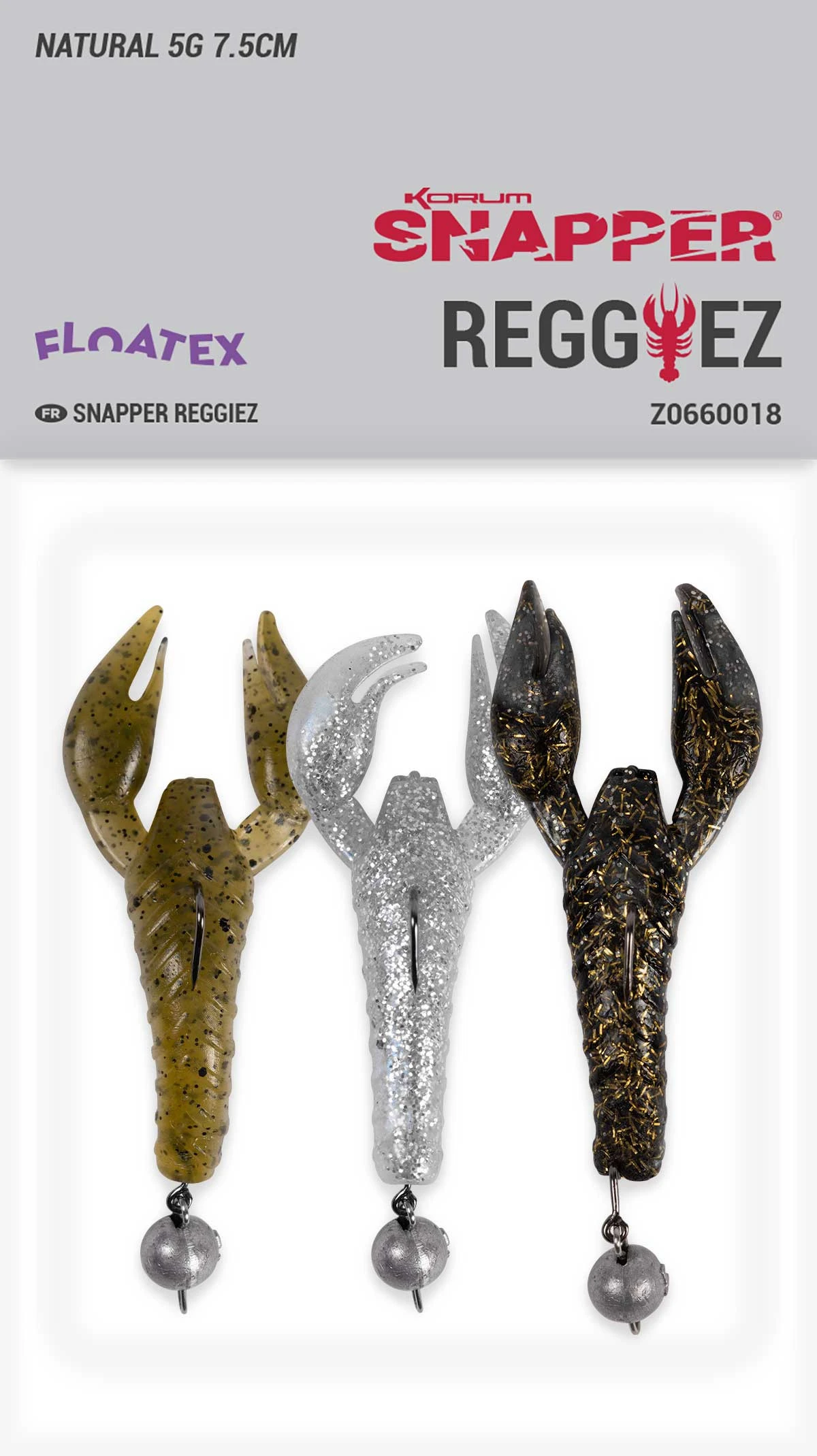 Reggiez zijn duurzame, drijvende kreeftimitaties die het mogelijk maken voor om heel effectief te kunnen vissen met de ‘Ned Rigging’ techniek. Het FLOATEX materiaal is veel zachter dan bij ander kunstaas, toch weerstaat het sneden en scheuren dankzij de rekbare compound. Dit aas is ongelooflijk, vis het langzaam binnen en laat de klauwen van de Reggiez waggelen, wiebelen en schudden.