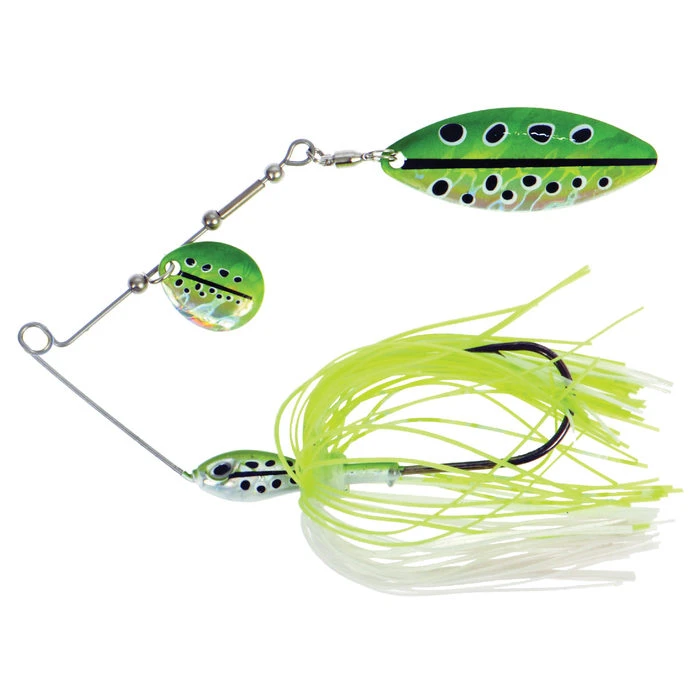 Deze spinnerbaits zorgen voor een onweerstaanbare aantrekkingskracht onderwater. De bladen zorgen voor veel reflectie en trillingen terwijl de zachte skirt een gewonde aasvis nabootst. De dubbele bladen draaien ook bij lage snelheid nog goed rond waardoor deze spinnerbait ook in kleiner water goed te gebruiken is.