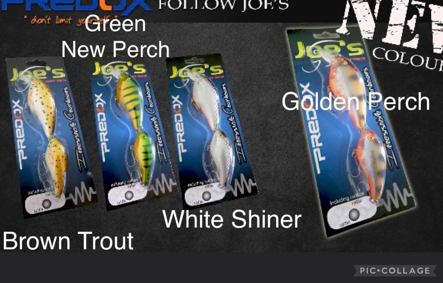 | Predox Joe kleuren | Brown Trout BT, Golden Perch GLD.P, Green New Perch GRN.P, White Shiner WS, Fire Tiger FT, Green Perch GP, Minnow MI, Orange Tiger OT |