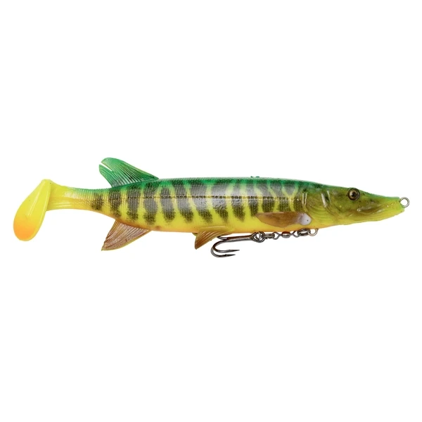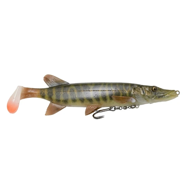 De Savage Gear 4D Pike Shad is gebaseerd op een 3D-scan van een echte baby snoek met perfecte details, Photo Chrome skin print en toegevoegde DNA-geur! Jonge snoeken maken deel uit van de voedselkringloop voor grote snoek en dit super realistische kunstaas is een perfecte imitatie! De op de buik gemonteerde dreg is bevestigd aan een wartel, waardoor het voor een snoek moeilijker is om de haak los te schudden tijdens een gevecht. De peddelstaart laat het lokaas verleidelijk schommelen en de rammelaar in de staart verspreidt lokkende vibraties. Hét kunstaas voor grote kannibalistische snoeken!